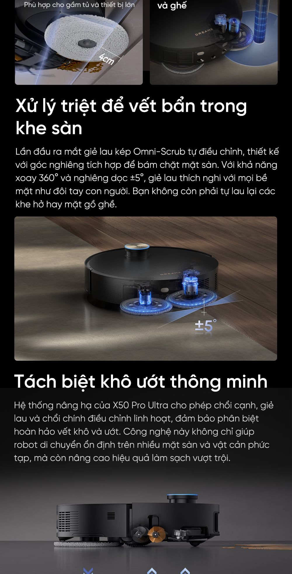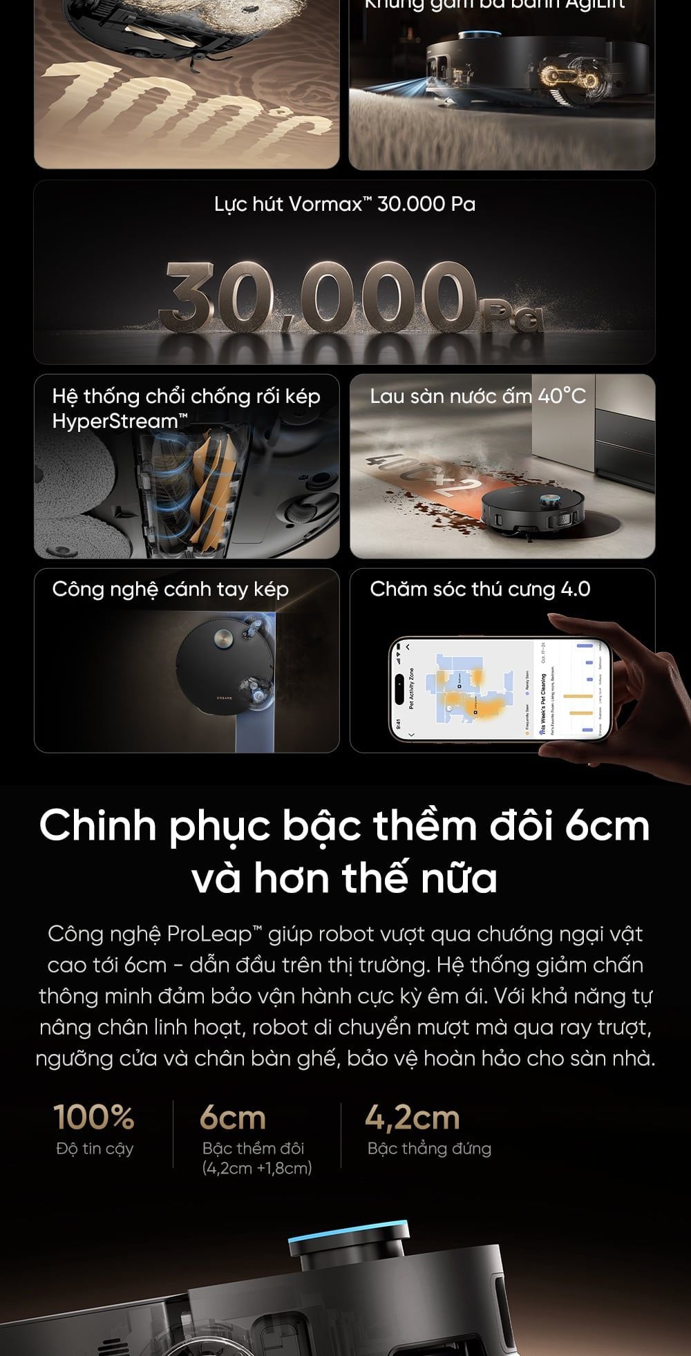 - Vượt chướng ngại vật ProLeap™ 6cm: Hệ thống giảm chấn thông minh đảm bảo vận hành cực kỳ êm ái. Với khả năng tự nâng chân linh hoạt, robot di chuyển mượt mà qua ray trượt, ngưỡng cửa và chân bàn ghế, bảo vệ hoàn hảo cho sàn nhà.