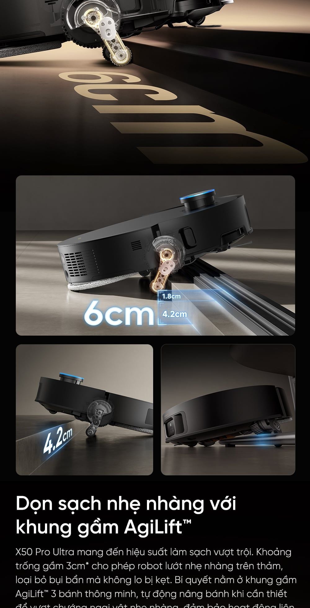 - Khung gầm AgiLift™ 3 bánh tự động nâng hạ, kết hợp khoảng trống gầm 3cm giúp robot làm sạch vượt trội trên thảm và di chuyển liên tục, không bị gián đoạn.