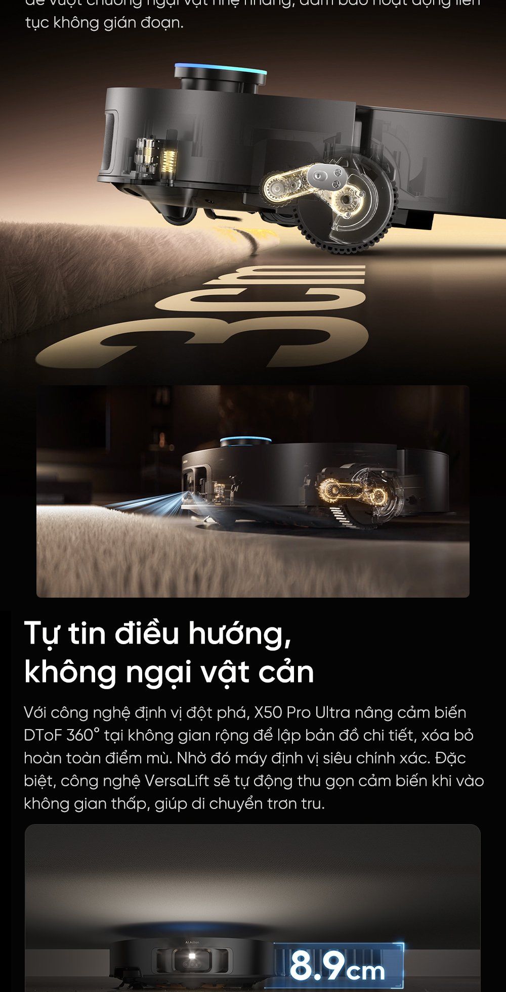 - Điều hướng chính xác, không điểm mù: Lập bản đồ chính xác, không điểm mù với cảm biến DToF 360°. Công nghệ VersaLift™ đảm bảo di chuyển trơn tru ngay cả trong không gian thấp.