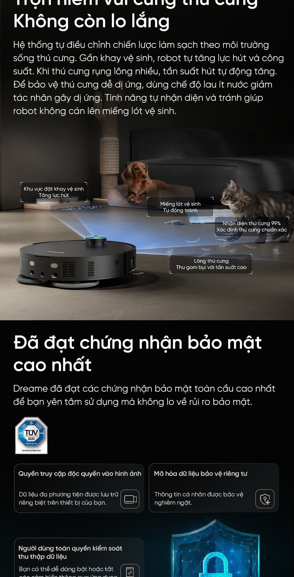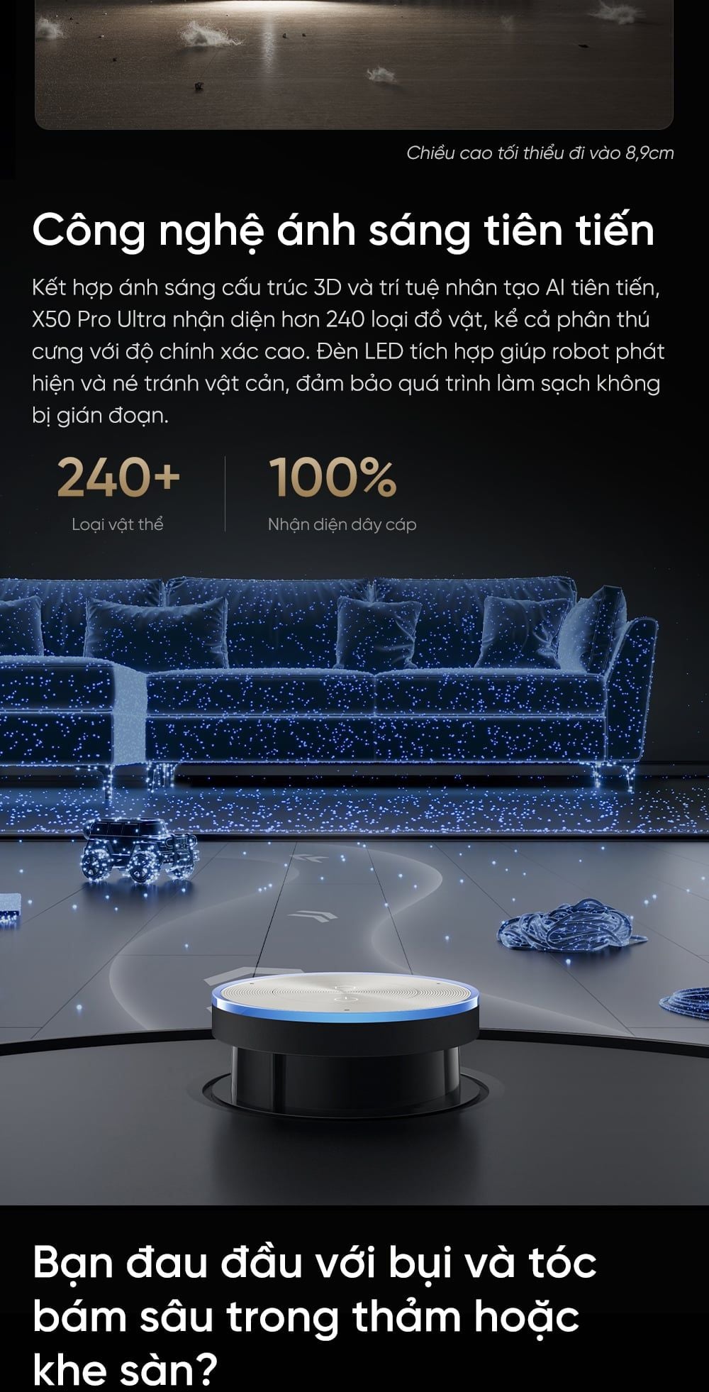 - Công nghệ ánh sáng tiên tiến: Nhận diện chính xác hơn 240 vật thể (kể cả phân thú cưng) bằng ánh sáng cấu trúc 3D và AI. Đèn LED tích hợp đảm bảo robot né tránh vật cản hiệu quả, không gián đoạn.