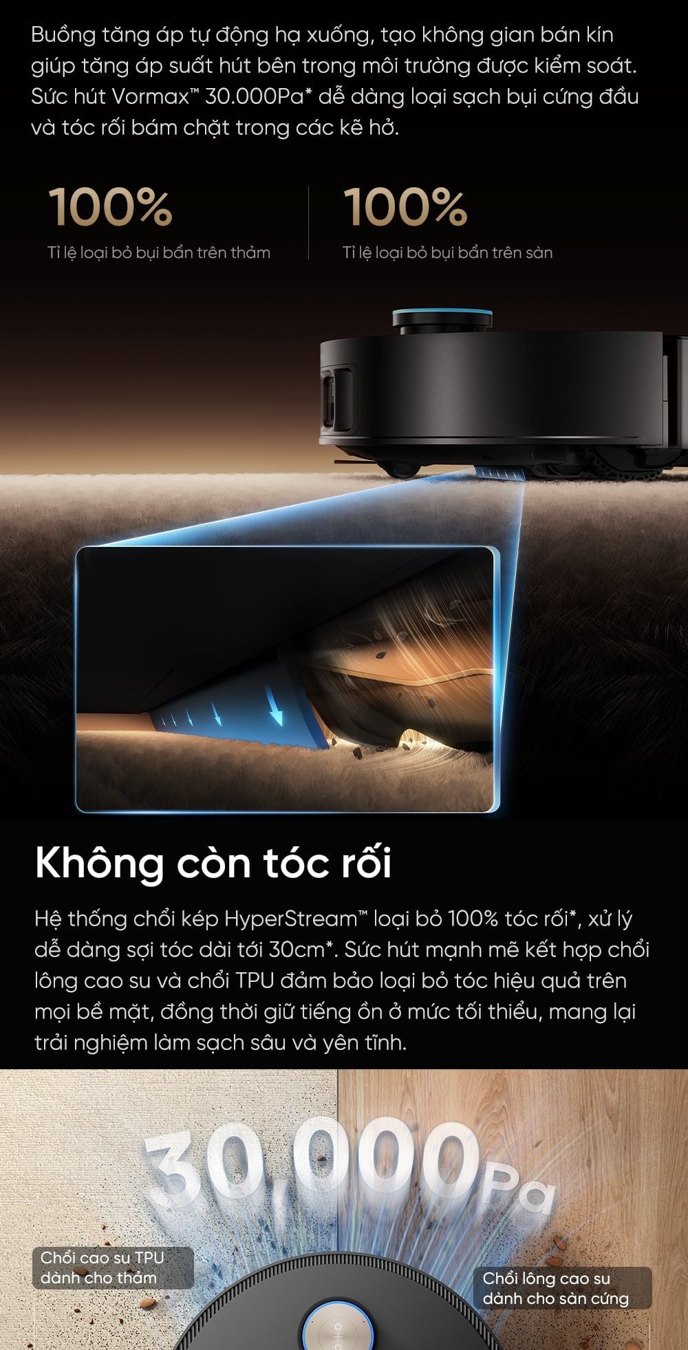 - Tạm biệt bụi bẩn bám sâu và tóc rối: Buồng tăng áp tự động kích hoạt, giải phóng lực hút Vormax™ 30.000Pa mạnh mẽ, dễ dàng hút sạch tóc và bụi cứng đầu khỏi mọi khe sàn, thảm.
