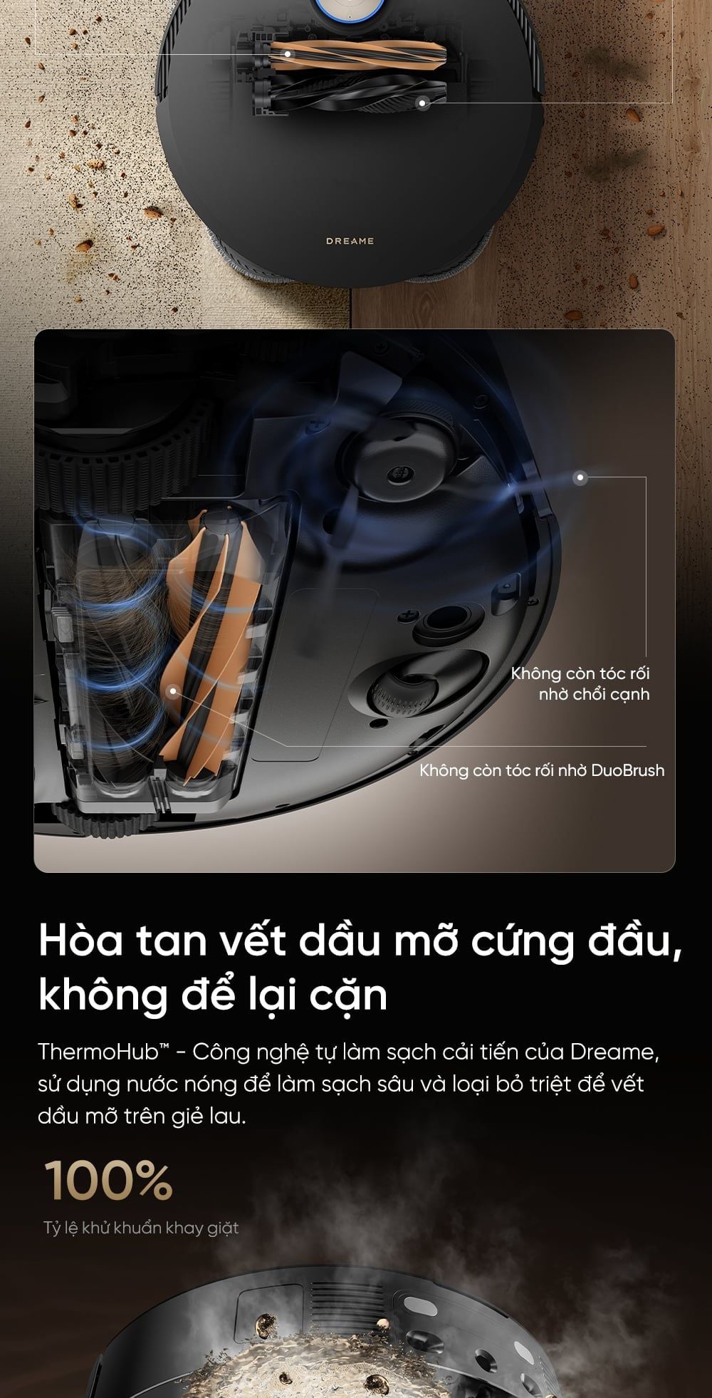 - ThermoHub™ – Công nghệ tự làm sạch cải tiến của Dreame, sử dụng nước nóng để làm sạch sâu và loại bỏ triệt để vết dầu mỡ trên giẻ lau.