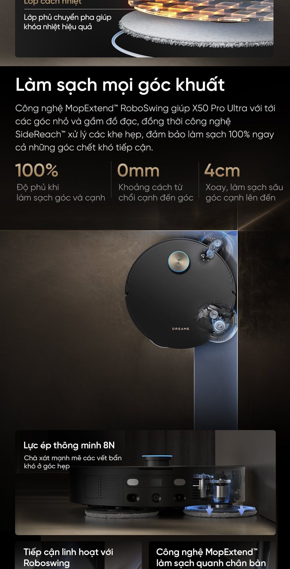 - Công nghệ MopExtend™ RoboSwing và SideReach™ giúp robot vươn tới mọi góc nhỏ, khe hẹp và gầm đồ đạc, đảm bảo làm sạch tuyệt đối.