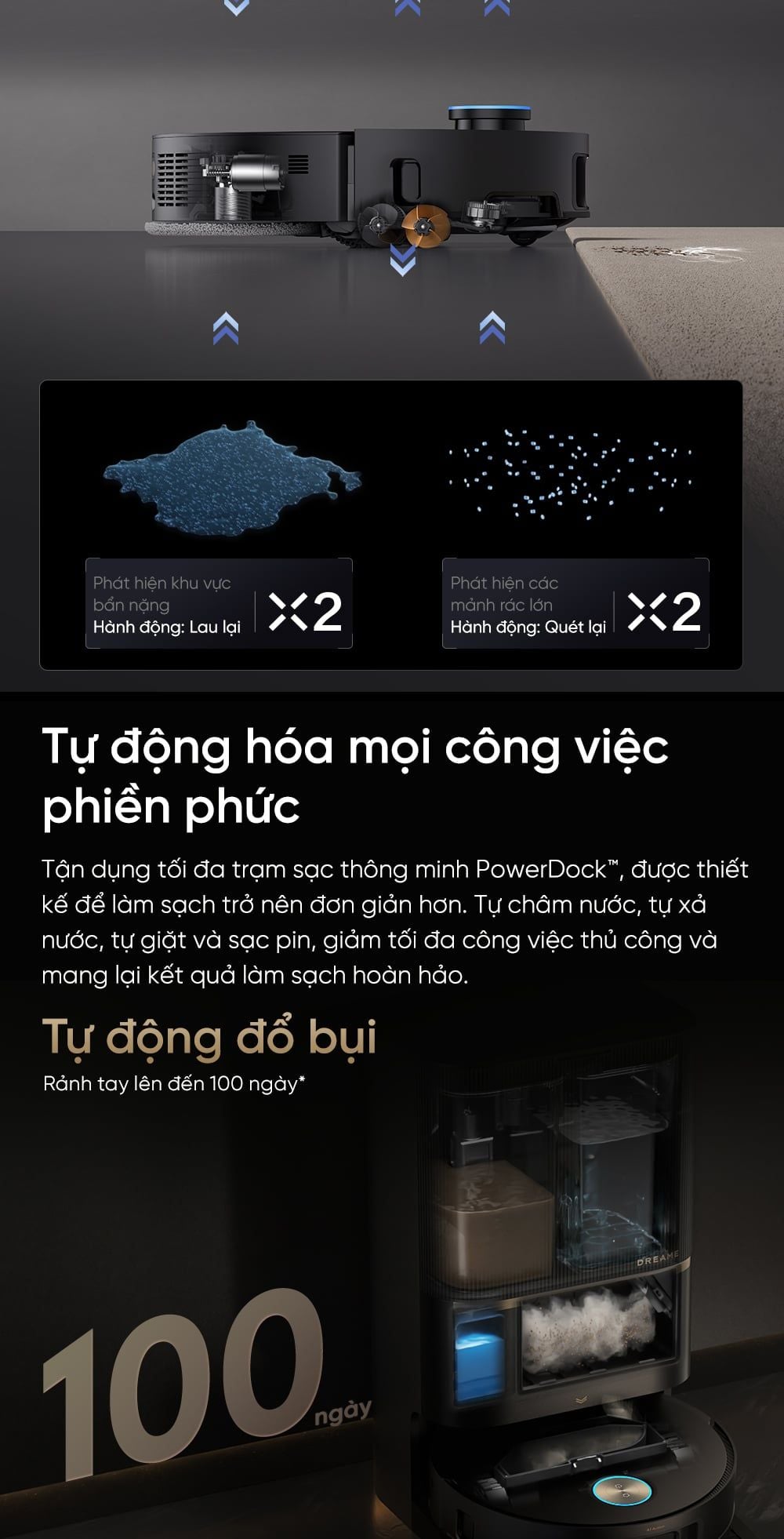 - Trạm sạc PowerDock™ lo liệu mọi việc: tự châm/xả nước, tự giặt giẻ và sạc pin. Đơn giản hóa việc dọn dẹp, tối đa hóa hiệu quả.