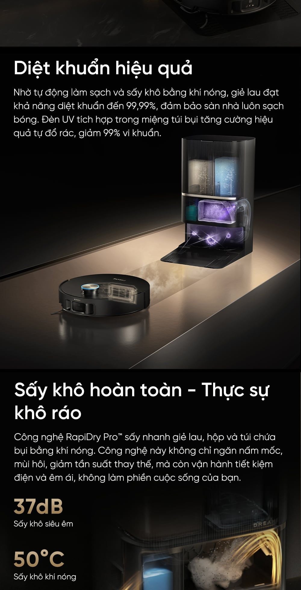 - Công nghệ RapiDry Pro™: Sấy khô hoàn toàn giẻ lau, hộp và túi bụi bằng khí nóng RapiDry Pro™. Ngăn nấm mốc, mùi hôi, và vận hành cực kỳ êm ái.