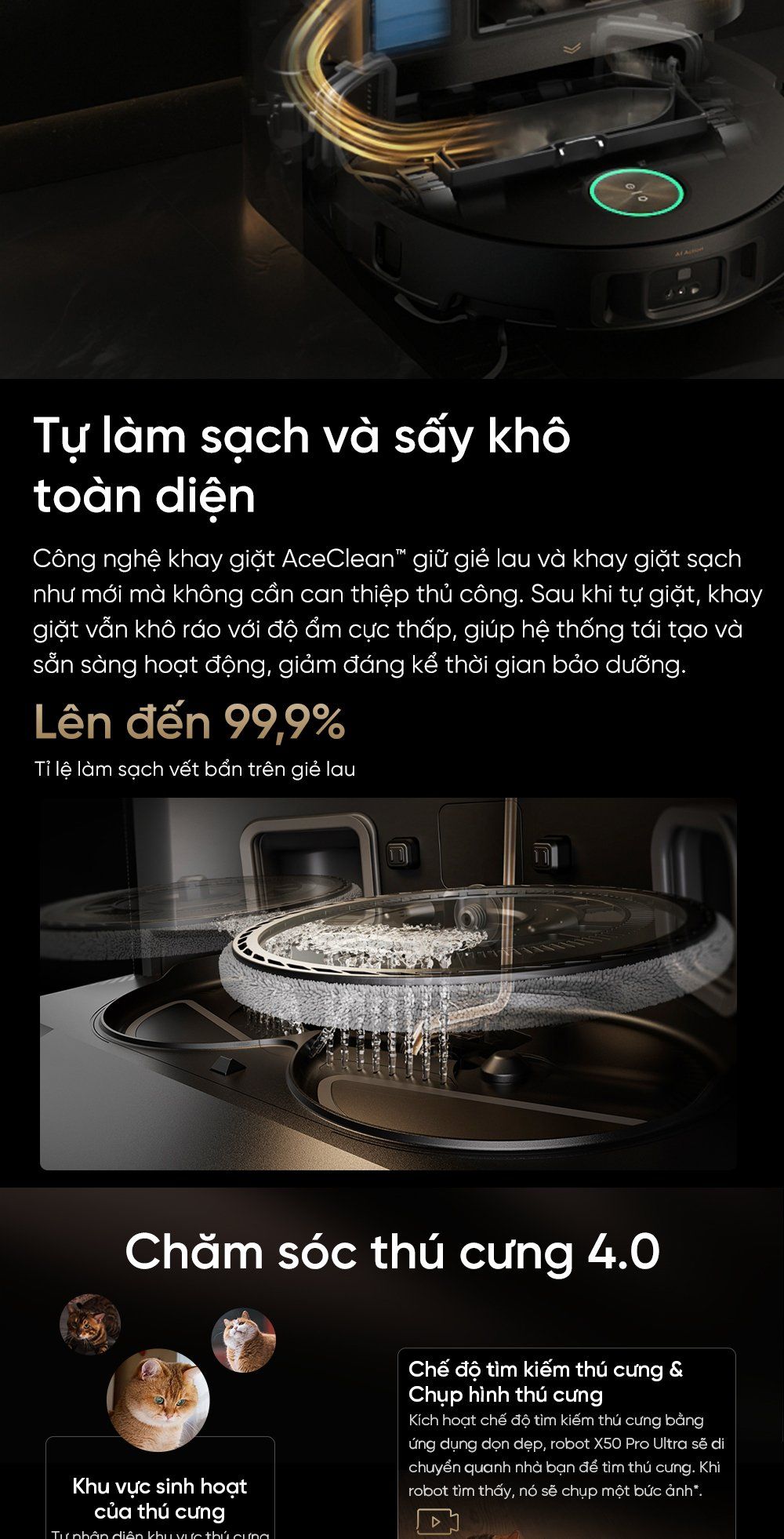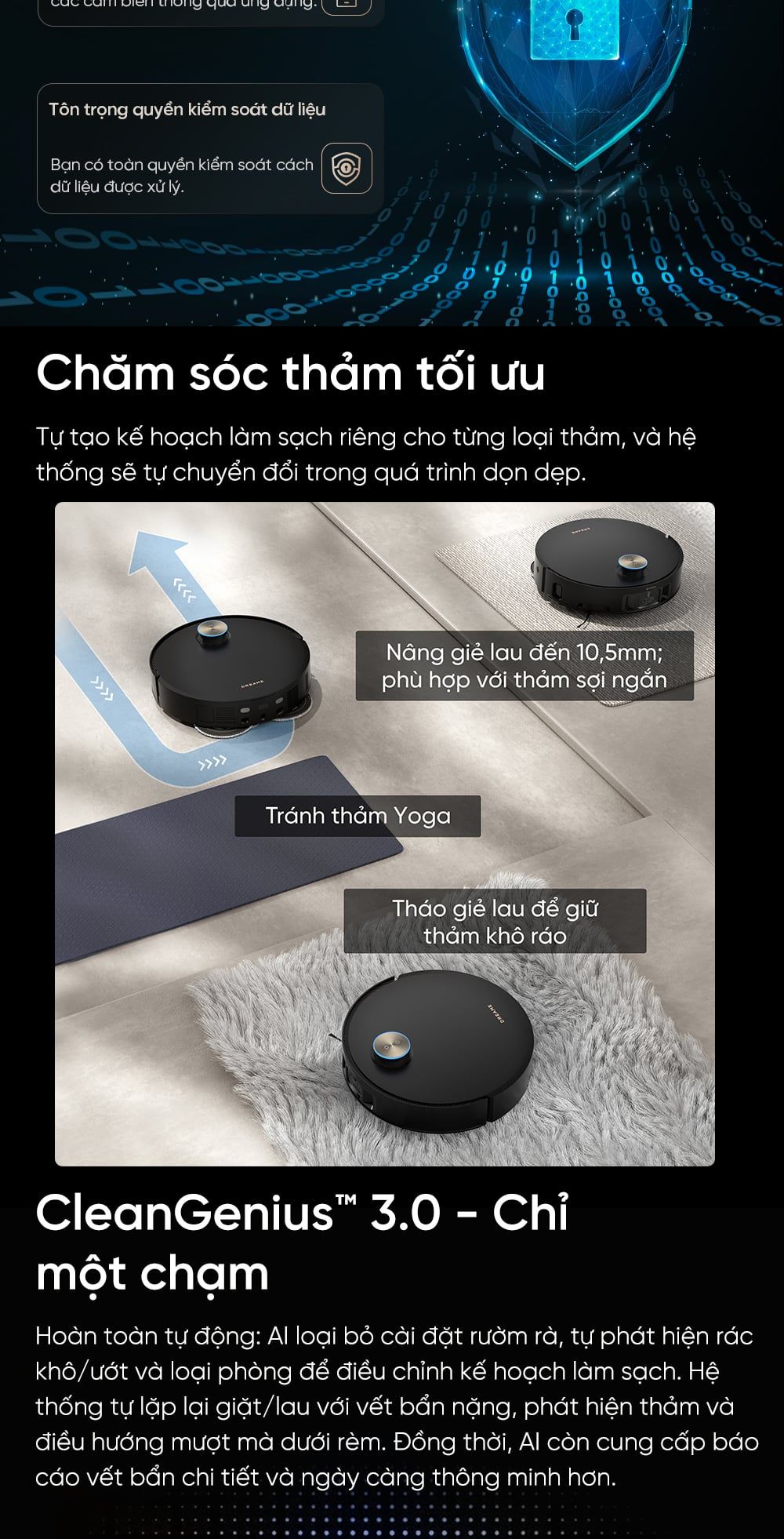 - CleanGenius™ 3.0: AI tự động phát hiện rác/phòng để điều chỉnh kế hoạch; tự giặt/lau lặp lại cho vết bẩn nặng; né rèm, phát hiện thảm. Tất cả chỉ với một chạm, robot ngày càng thông minh hơn.