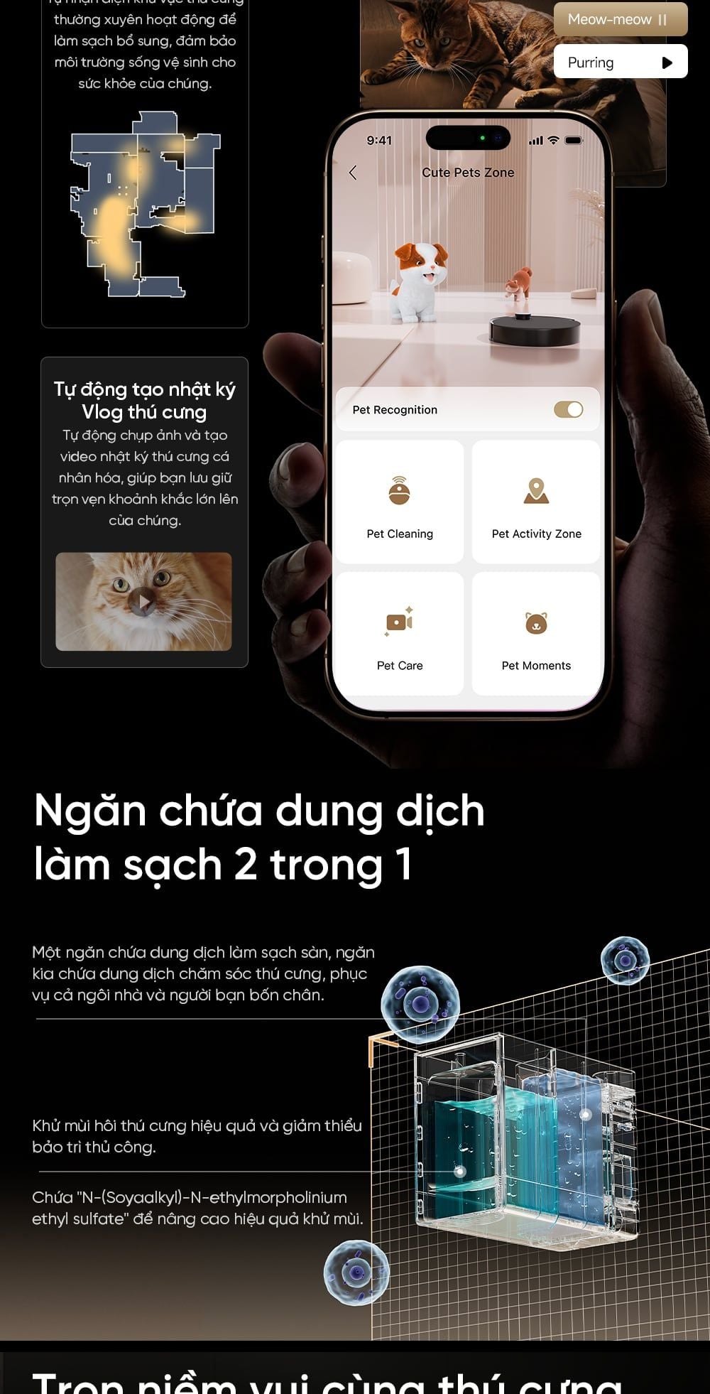 - Ngăn chứa dung dịch kép: Robot được trang bị ngăn chứa dung dịch 2 trong 1, tách biệt dung dịch làm sạch sàn và chăm sóc thú cưng.